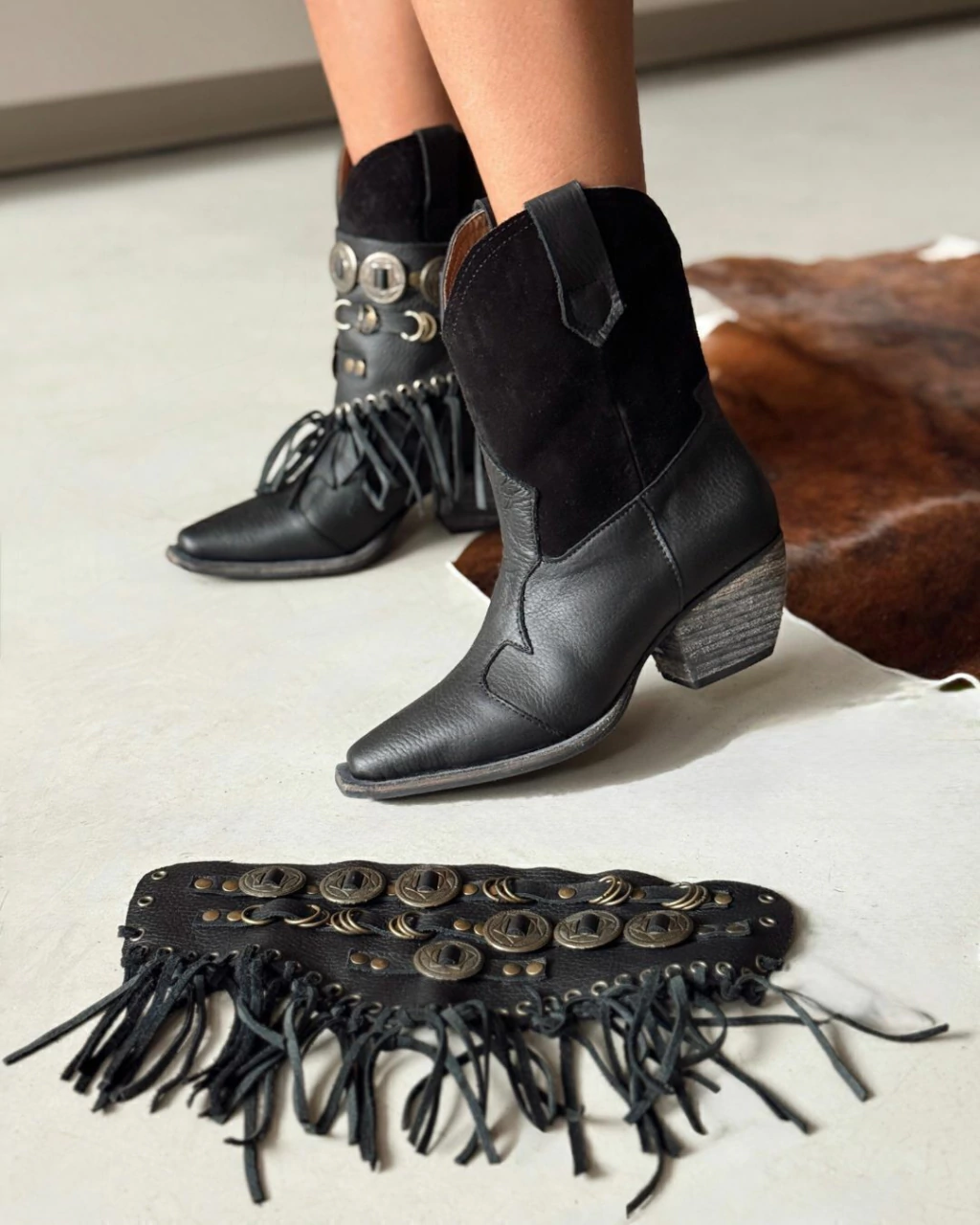 Texanas caña media, confeccionadas combinando dos tipos de cuero, con su interior forrado en cuero. Este modelo cuenta con un cinto desmontable de flecos y apliques color bronce, lo que permite tener dos botas en una y la convierte en un comodín infaltable.